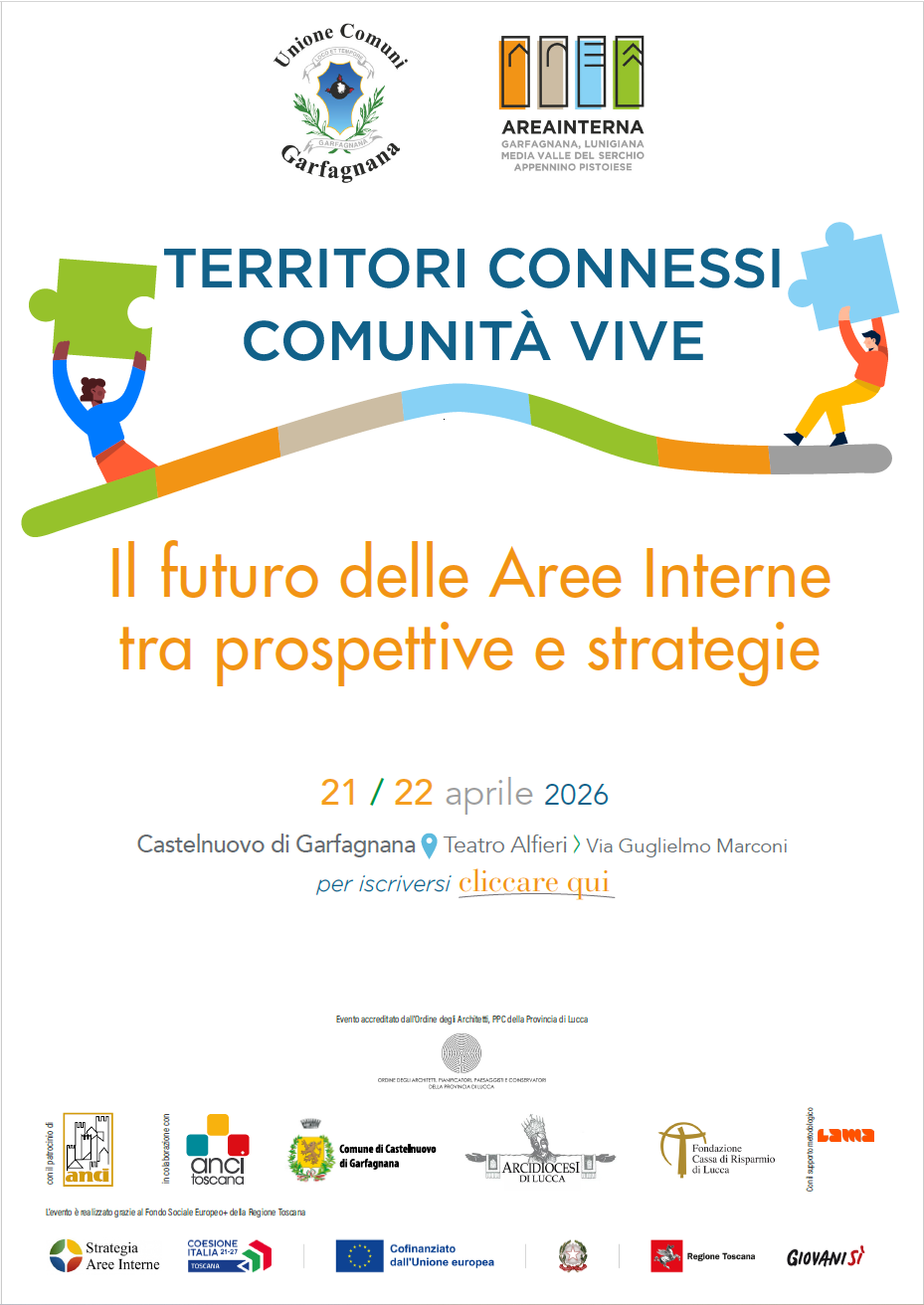 L’Unione Comuni Garfagnana, in qualità di Ente capofila per l’attuazione della Strategia di Area Interna “Garfagnana – Lunigiana – Media Valle del Serchio – Appennino Pistoiese”, organizza martedì 21 e mercoledì 22 aprile, presso il Teatro Alfieri di Castelnuovo di Garfagnana, l’importante convegno “Territori connessi, comunità vive: il futuro delle Aree Interne tra prospettive e strategie”: due giornate di confronto e lavoro dedicate al futuro delle Aree Interne, per mettere al centro comunità, territori e politiche di sviluppo.