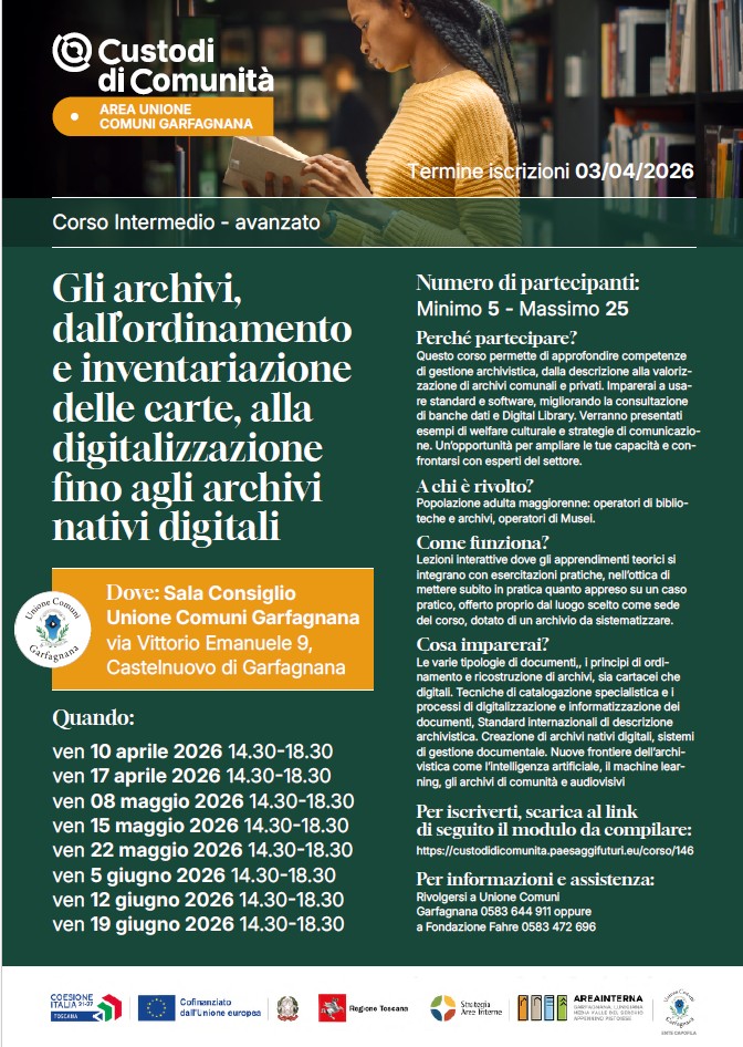 C’è tempo fino al 3 aprile 2026 per iscriversi al “Corso intermedio-avanzato: Gli archivi, dall’ordinamento e inventariazione delle carte, alla digitalizzazione fino agli archivi nativi digitali” articolato in un ciclo di otto incontri che si terranno presso la sede istituzionale dell’Unione Comuni Garfagnana venerdì 10 e 17 aprile, 8, 15 e 22 maggio, 5, 12 e 19 giugno dalle ore 14.30 alle ore 18.30.